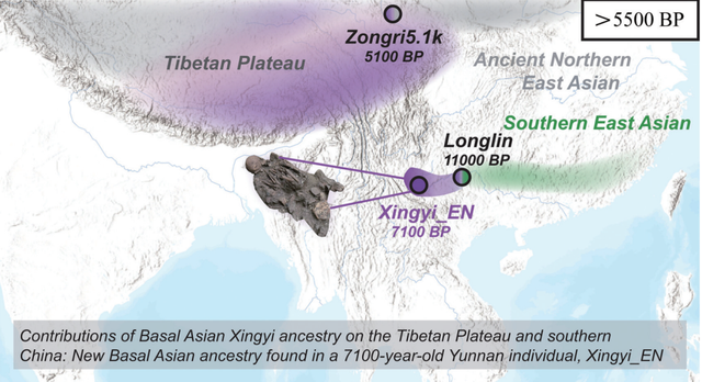 单一位来自云南的“7100岁老人”展现出其基础亚洲血统,这与青藏高原人群中一个深度分化的“幽灵血统”相关